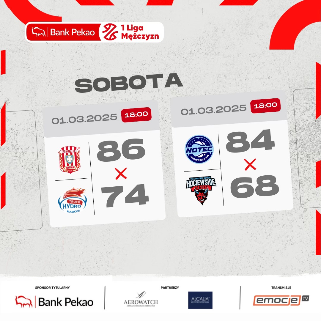 Niezwykle ciekawie w tym sezonie Pekao S.A. 1 Ligi Mężczyzn wygląda walka o utrzymanie. W starciu drużyn marzących o oddaleniu się od strefy spadkowej OPTeam Energia Polska Resovia Rzeszów pokonała HydroTrucka Radom 86:74, ale nie uzyskała lepszego bilansu w dwumeczu. Miejsce w górnej części tabeli utrzymała KSK Qemetica Noteć Inowrocław, która po zmianie stron zdominowała rywalizację z SKS Fulimpex Starogard Gdański.