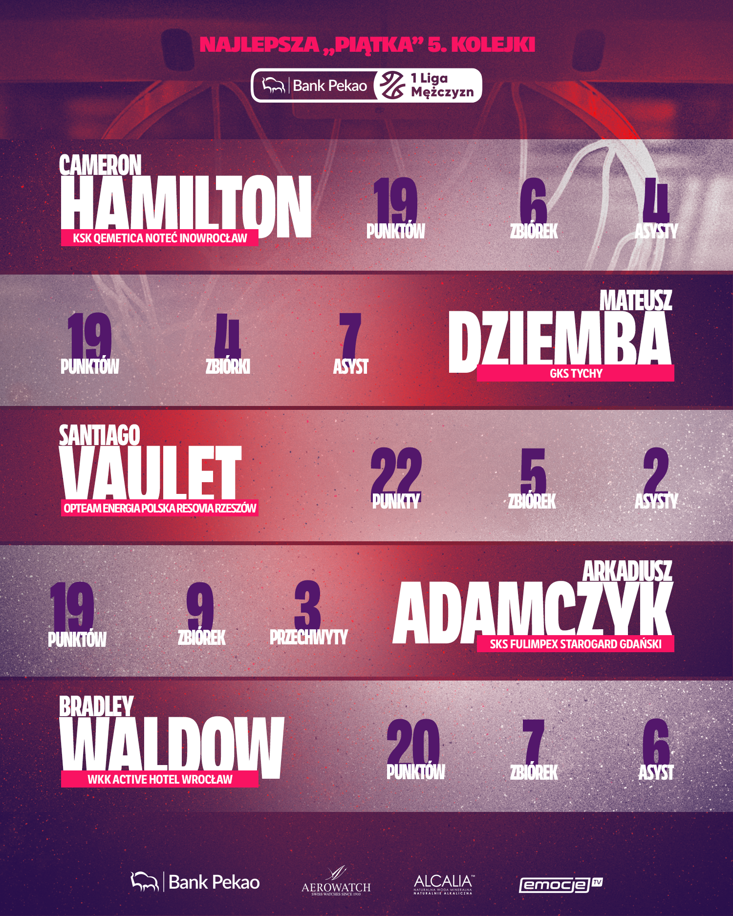 - zgodnie z zasadami gry w Pekao 1 Lidze Mężczyzn, w piątce kolejki znaleźć się może maksymalnie dwóch zawodników zagranicznych