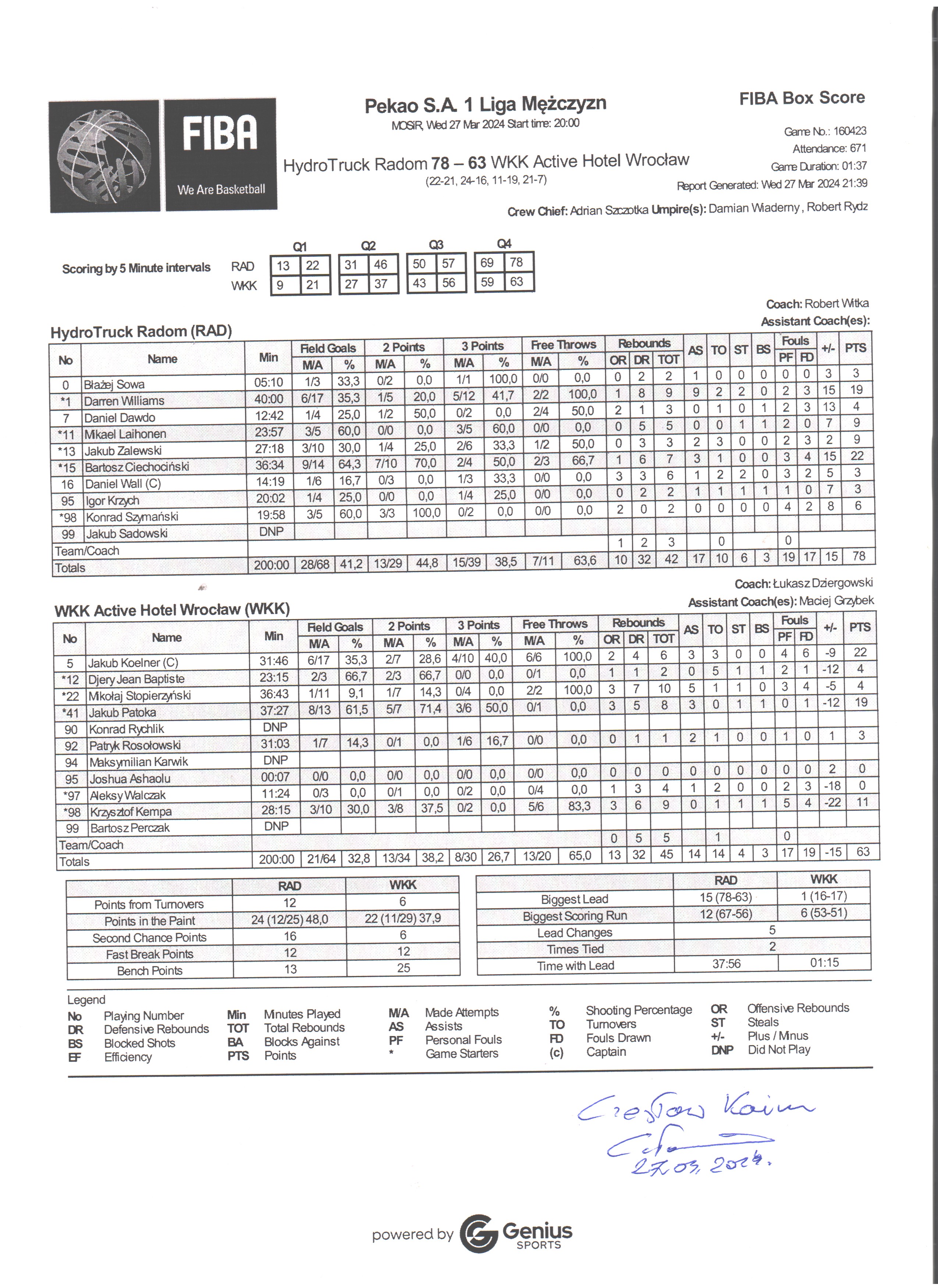 | 09:14:00 | 97, A. Walczak, asysta | |||